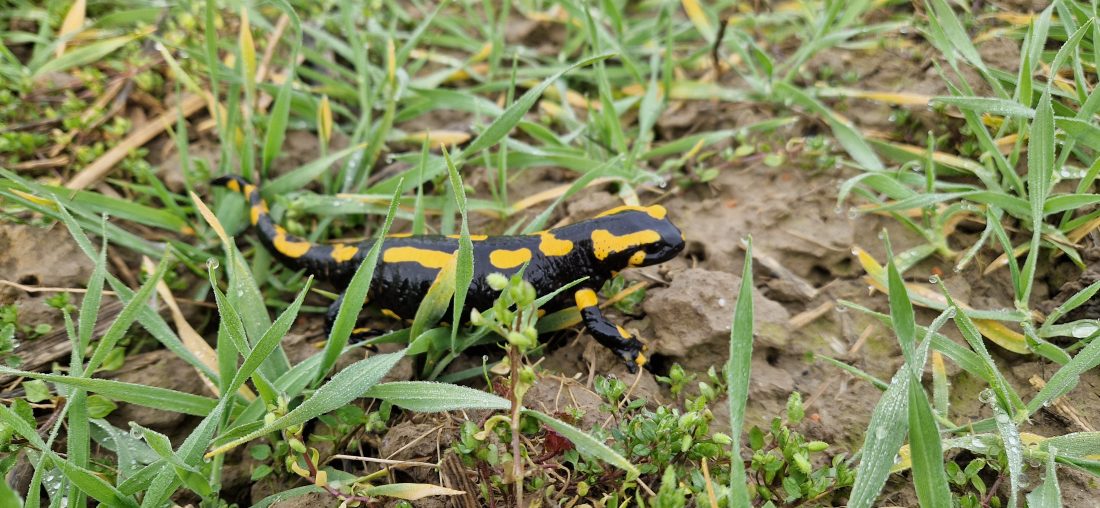 Titel des Bildes Feuersalamander in Wintergerste